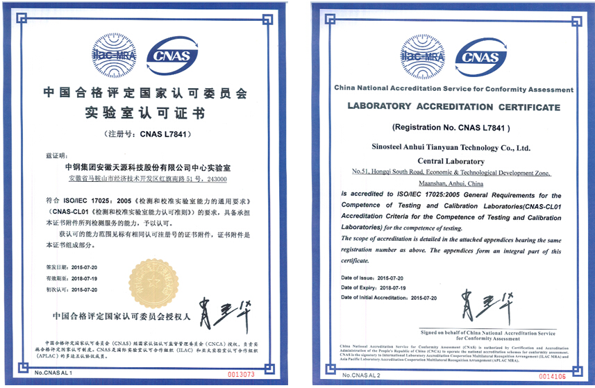 針對(duì)現(xiàn)場(chǎng)評(píng)審提出的問(wèn)題和不符合項(xiàng),公司中心實(shí)驗(yàn)室經(jīng)過(guò)近3個(gè)月的整改,于2015年6月初將整改報(bào)告遞交至CNAS,CNAS確認(rèn)了申請(qǐng)認(rèn)可的多個(gè)檢測(cè)項(xiàng)目的檢測(cè)能力,并于2015年8月4日向中鋼天源中心實(shí)驗(yàn)室頒發(fā)了CNAS認(rèn)可證書。
