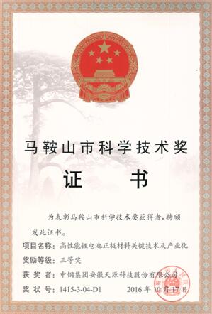會議宣讀了《馬鞍山市人民政府關(guān)于2014-2015年度馬鞍山市科學(xué)技術(shù)獎勵的決定》,中鋼天源駱艷華、楊洋、裴曉東等同志承擔(dān)的省科技攻關(guān)項目《高性能鋰電池正極材料關(guān)鍵技術(shù)及產(chǎn)業(yè)化》獲得“馬鞍山市科技進步三等獎”。