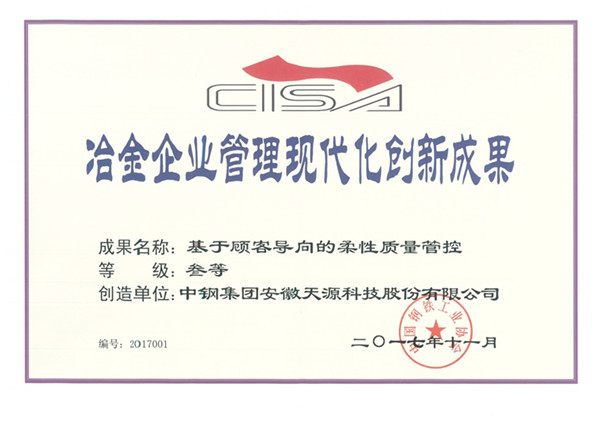 據悉,2017年冶金企業(yè)管理現代化創(chuàng)新成果評選結果日前揭曉,中鋼天源本部申報的管理創(chuàng)新成果《基于顧客導向的柔性質量管控》榮獲三等獎。